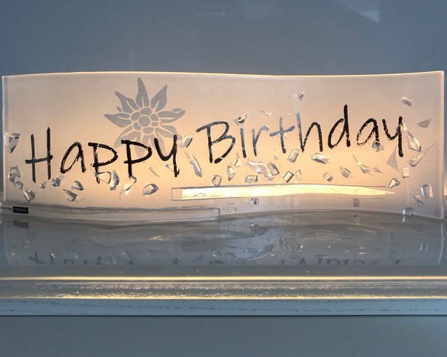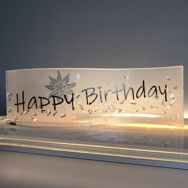 o13 Happy Birthday-Welle aus Glas mit versilbertem Schriftzug . 10 x 30 cm