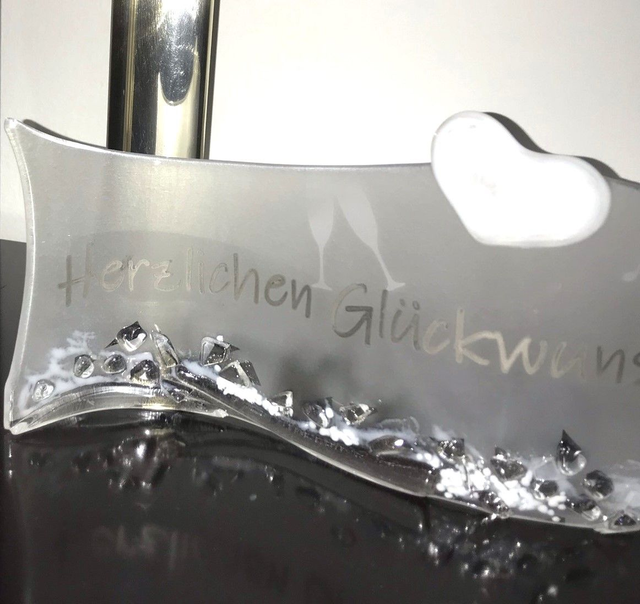 dea 4 o52022 02 Glaswelle mit versilbertem Schriftzug ■ Größe 12x30 cm ■ Handmade ■ vergoldet ■ sandgestrahlten mit Piktogrammen u.a. Sektgläser/Noten/ (individuelle Motivauswahl ist möglich) ■ auch ohne weißes Glasherz erhältlich ■ Einzelstück ■ weitere Modelle auf der Homepage ■ Lieferzeit 2-5 Tage ■ www.trumpp-design.com / deco
