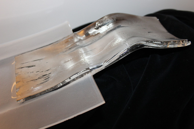 tk 1 o52020 04 Glasschale mit versilbertem Griff ■ sandgestrahlt ■15 x 37 cm ■ in div. Farben erhältlich ■ mit/ohne Holz-Basis erhältlich ■ Preis ohne Basis ■ Handmade ■ Lieferzeit 2-5 Tage ■ Näheres www.trumpp-design.com / tischkultur