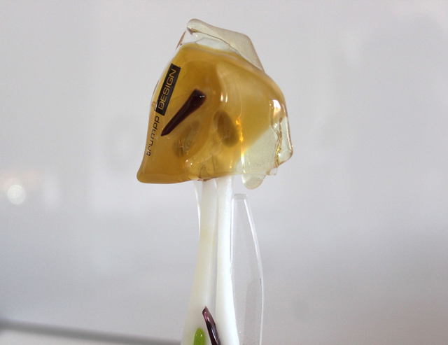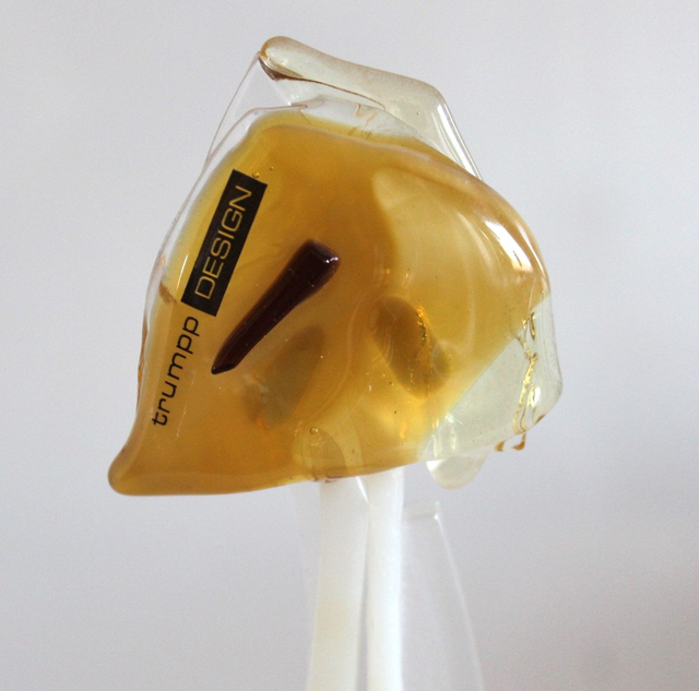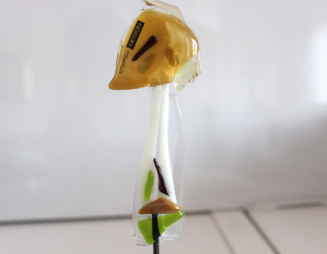 dea 6 202020 04 Pilz Impressionen aus Glas auf Stab – in Bernsteioptik ■ Einzelstück ■ 5 x 13 cm / Höhe 20 cm ■ Basisteil / Eisenfuß 1,5 x 5 x 5 cm ■ nach Anfrage bieten wir bearbeitete Wurzel an ■ Atelierarbeit ■ Handmade ■ Made in Germany ■ Lieferzeit 2 - 5 Tage ■ Näheres www.trumpp-design.com /deco